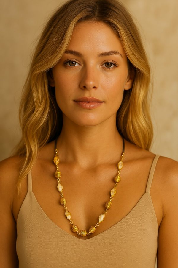 Collana Capim Dourado e citrino- Gioielli Solari per il Tuo Negozio Scopri la perfetta armonia tra l'artigianato brasiliano e le pietre preziose con le nostre collane in Capim Dourado impreziosite da citrino, ora disponibili all'ingrosso per il tuo negozio. Il citrino, noto come la "pietra del sole", dona luce e vitalità, simbolizzando prosperità e abbondanza. Questa pietra si abbina magnificamente alla bellezza naturale del Capim Dourado, creando un gioiello che attira lo sguardo e l'anima. Ogni collana viene fornita con una scatola che illustra l'eccellenza artigianale del Capim Dourado, e un cartellino che descrive le proprietà benefiche del citrino, rendendo il prodotto un'esperienza completa per i tuoi clienti. Un gioiello imperdibile per chi cerca bellezza e significato nei dettagli. Offri ai tuoi clienti collane in Capim Dourado con pietre di citrino, perfette per aggiungere un tocco di eleganza naturale e calore. Inclusa scatola con informazioni sull'artigianato e cartellino sulle proprietà del citrino. Vendita all'ingrosso collane con citrino
