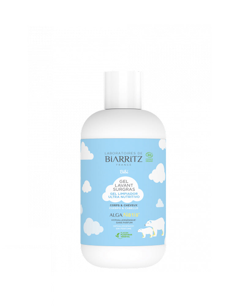 Alga Natis Surgras (ultra-rich) Cleansing Gel cleanses delicate skin and scalp (sweat, sebum, cradle cap...) without damaging the still delicate skin barrier. Thanks to its hydrating, nourishing and ultra-rich ingredients, it helps preserve the hydrolipidic film and prevent dehydration.