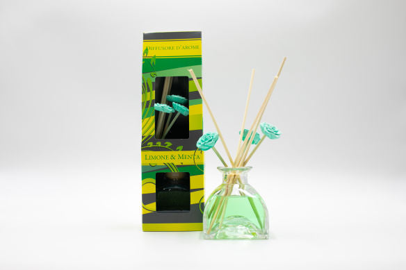 pungent scent of mint, in harmony with the aroma of lemon, creates an atmosphere with sparkling and cheerful tones. The diffuser
