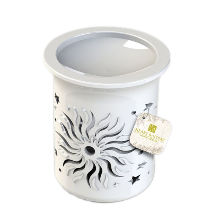 Un hermoso quemador de cerámica blanca con un sol tallado que creará un parpadeo mágico en la vela. Un accesorio que añadirá un toque de estilo a tu decoración. Para utilizar el quemador, simplemente coloque una vela de té en la sección inferior y su oblea Heart & Home se derretirá en el plato de arriba. ¡Tan pronto como la cera se derrita, el aroma de la fragancia elegida se esparcirá, embriagando toda la casa!